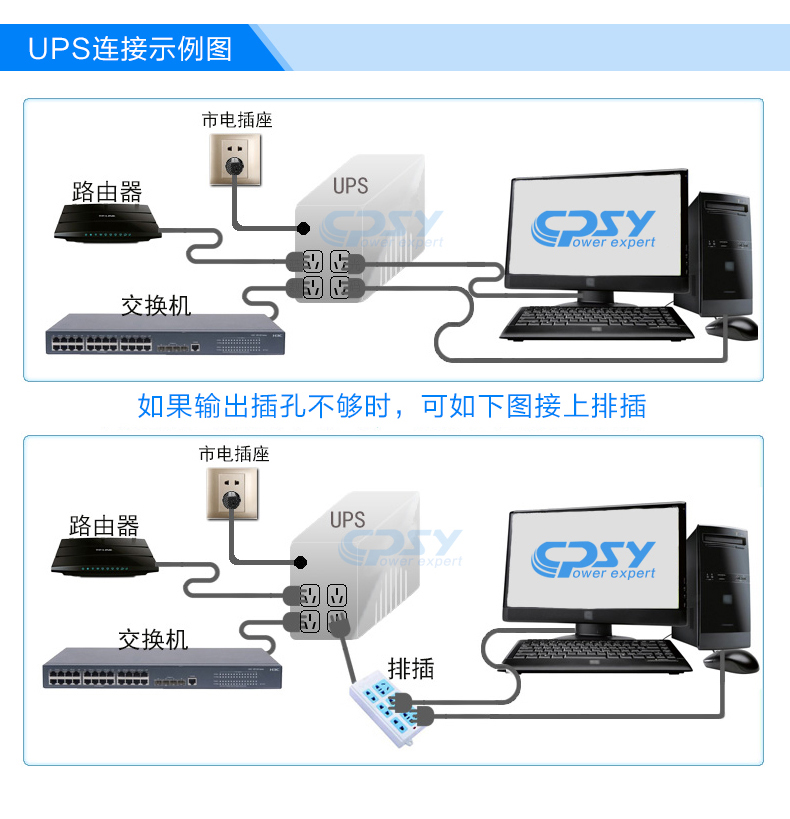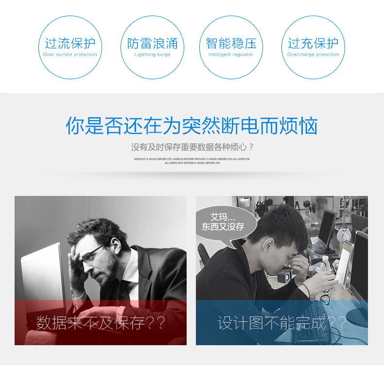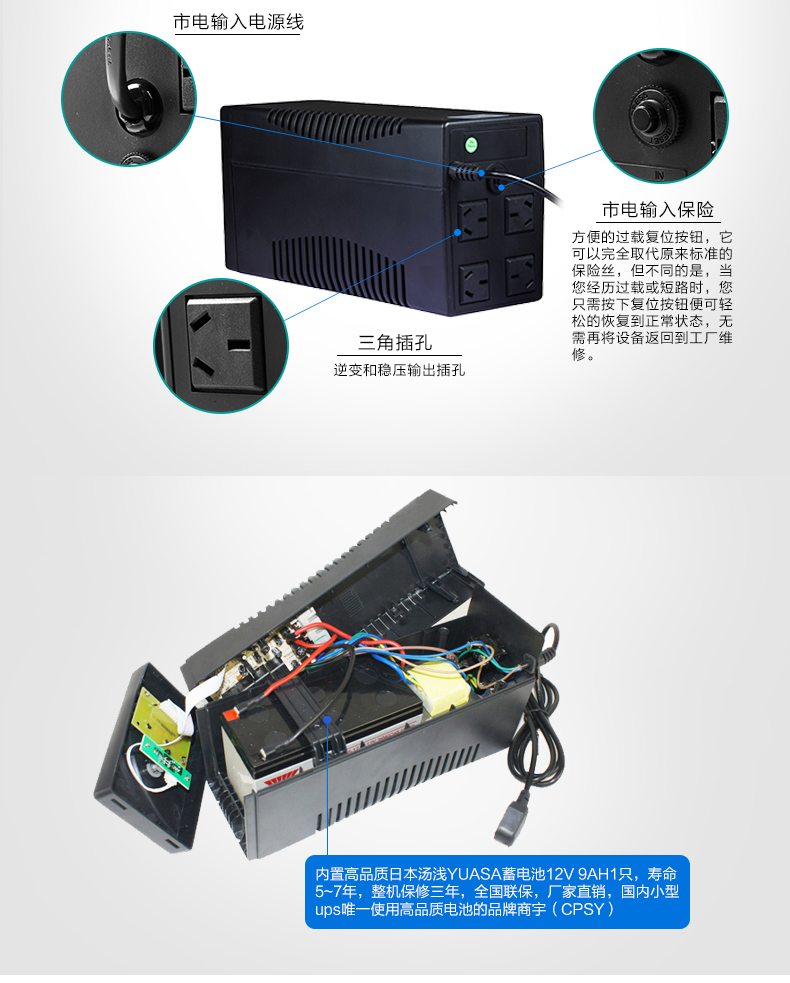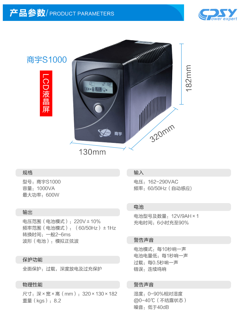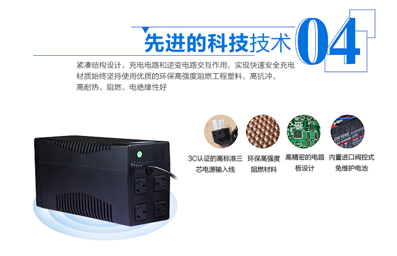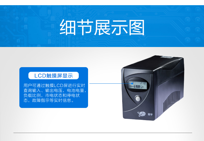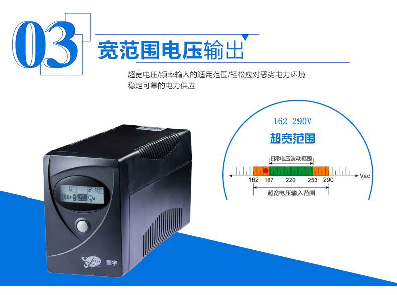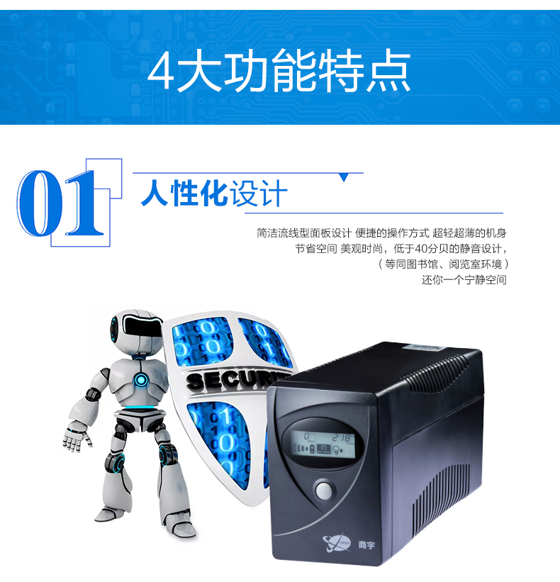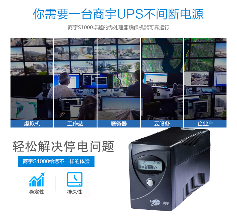 商宇s系列后备式电源是针对中国市场电力环境优化设计的自动稳压型UPS,通过先进MCU 控制及可靠功率设计,有效的解决5 种电力问题(市电断电、电压下陷、浪涌、欠压、过压),同时进一步提高了产品的适应性和可靠性,为用户设备以及UPS 本身 提供万无一失的保障。 主要应用场景描述 * 个人电脑,网络设备及娱乐设备 PC、家用路由器、 家用影音、娱乐系统等 *办公及商务设备 办公电脑、POS机等设备 *嵌入式应用 ATM柜员机、广告机等设备