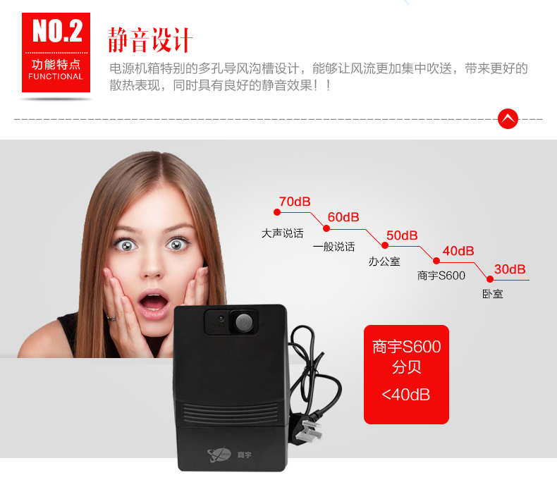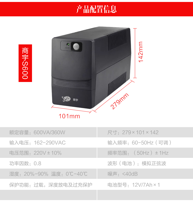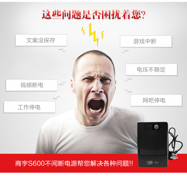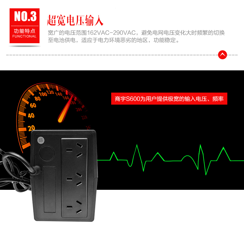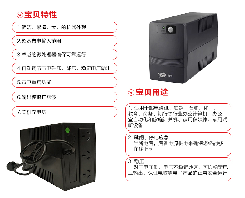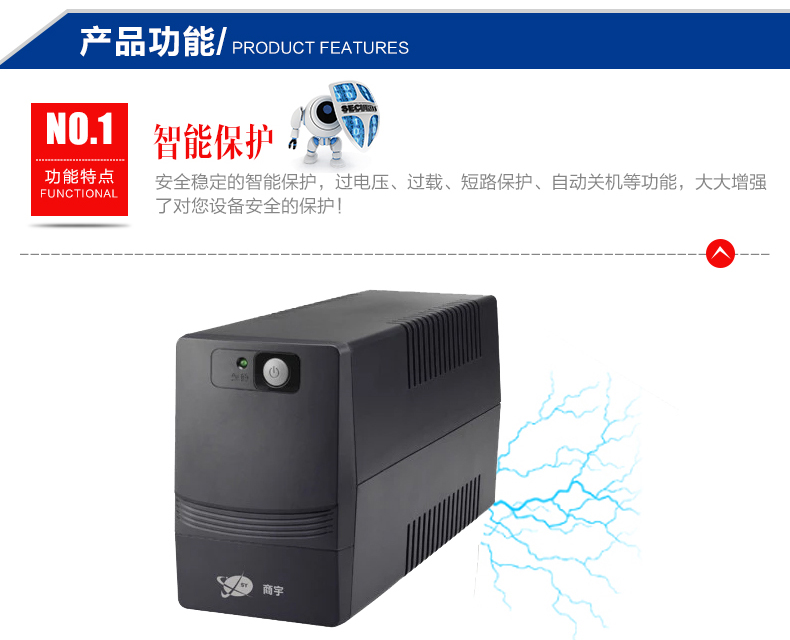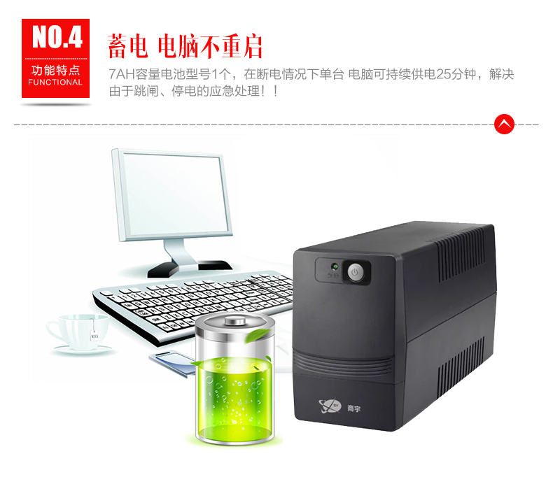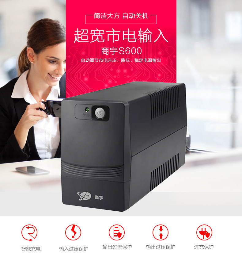 商宇s系列后备式电源是针对中国市场电力环境优化设计的自动稳压型UPS,通过先进MCU 控制及可靠功率设计,有效的解决5 种电力问题(市电断电、电压下陷、浪涌、欠压、过压),同时进一步提高了产品的适应性和可靠性,为用户设备以及UPS 本身 提供万无一失的保障。 主要应用场景描述 * 个人电脑,网络设备及娱乐设备 PC、家用路由器、 家用影音、娱乐系统等 *办公及商务设备 办公电脑、POS机等设备 *嵌入式应用 ATM柜员机、广告机等设备