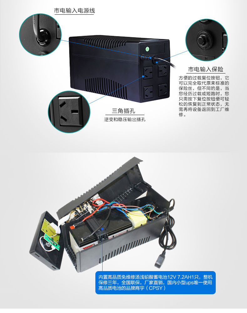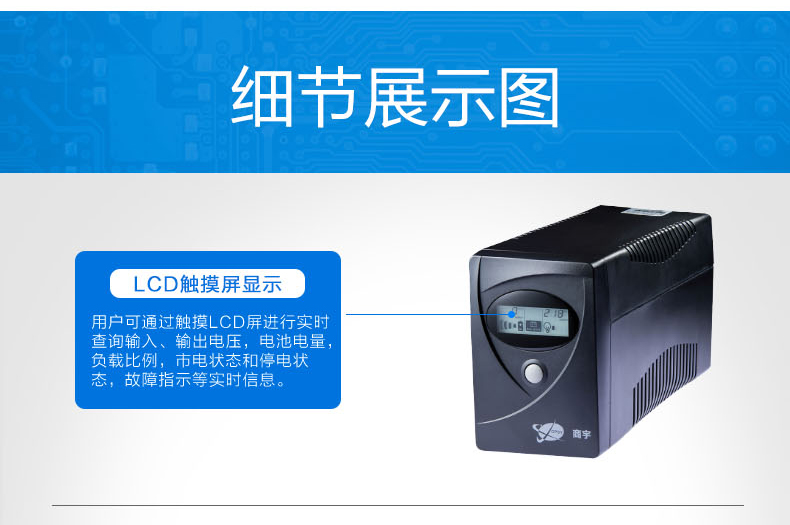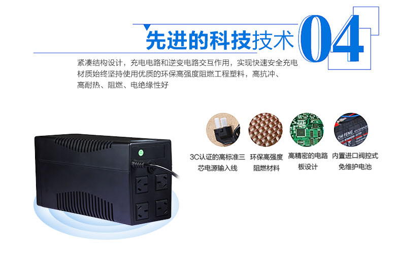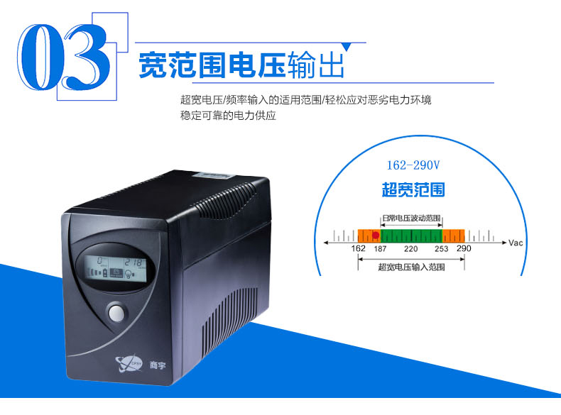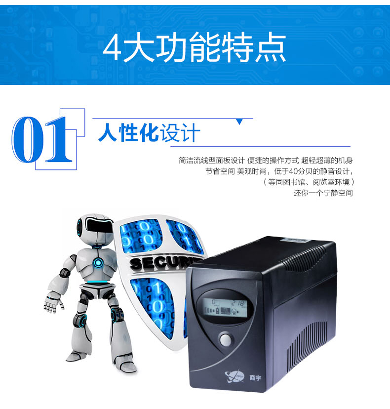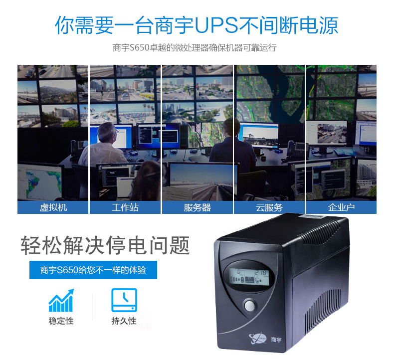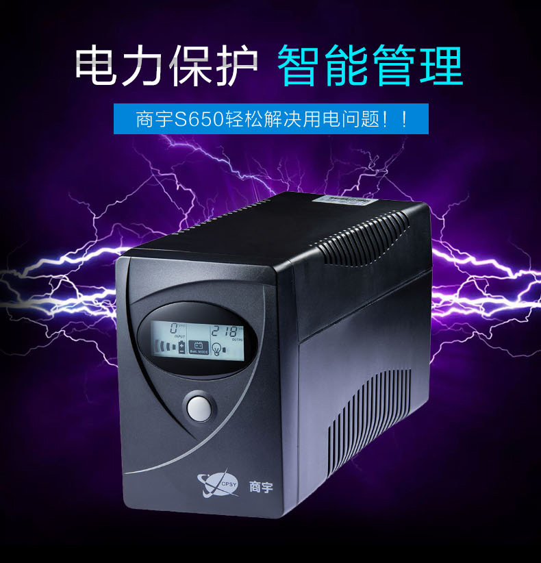 商宇s系列后备式电源是针对中国市场电力环境优化设计的自动稳压型UPS,通过先进MCU 控制及可靠功率设计,有效的解决5 种电力问题(市电断电、电压下陷、浪涌、欠压、过压),同时进一步提高了产品的适应性和可靠性,为用户设备以及UPS 本身 提供万无一失的保障。 主要应用场景描述 * 个人电脑,网络设备及娱乐设备 PC、家用路由器、 家用影音、娱乐系统等 *办公及商务设备 办公电脑、POS机等设备 *嵌入式应用 ATM柜员机、广告机等设备